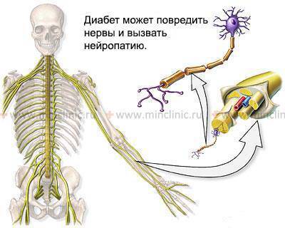 Диабет может поражать миелиновую оболочку нервов и вызывать диабетическую полинейропатию (полиневрит).