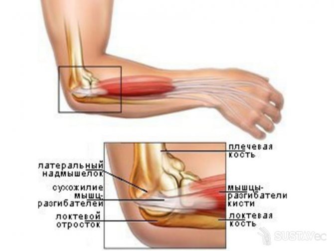 - Тенденитом. Длительные микротравмы с перегрузкой локтевых суставов, запястий, приведут к воспалительным процессам сухожилий. Воспаляется участок, где крепится сухожилие к кости.