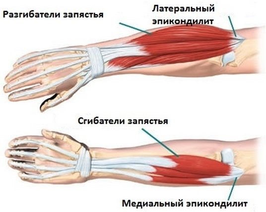 - Перегрузка запястного, локтевого суставов во время занятий спортом, также могут воспаляться сухожилия, начнется боль в мышцах.