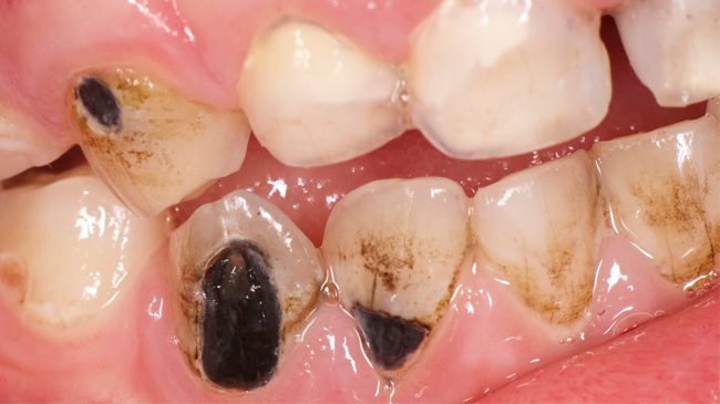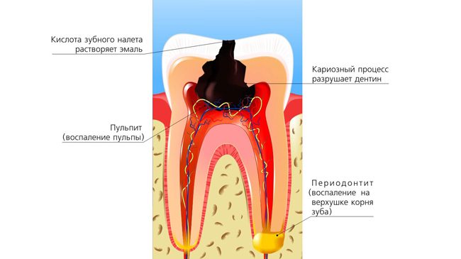 - Это могут быть сильные кариозные проблемы, разрушающие зубы. На их месте возникают полости, в которые может попасть инфекция или пища, постоянно раздражающая оголённые нервные окончания.