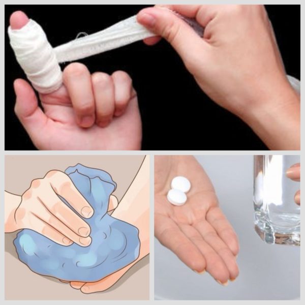 - Если боль сильная, можно приложить к пальцу холодный компресс. Это также поможет снять отек и гематому, если таковые намечаются. При этом важно следить, чтобы не обморозить кожу. Для этого лед нужно завернуть в кусочек ткани. Прикладывания холодного нужно делать в несколько подходов, по 10 минут каждый.