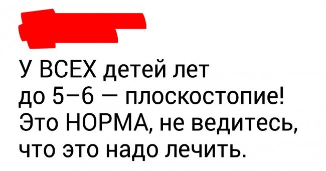 - У детей лет до 5–6 плоскостопие – норма, не верьте утверждению, что это надо лечить. Вашему ребенку не нужна обувь с супинатором, не нужна обувь с жестким задником, не нужны стельки. Все, что нужно – это заниматься воспитанием стопы (упражнения можно найти в интернете).
