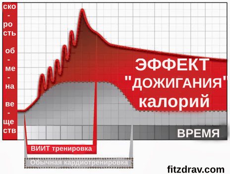 Как это возможно? Ключевым моментом является термин, называемый избыточным потреблением кислорода после нагрузки или “дожиганием” – количество калорий, сжигаемых после тренировки.