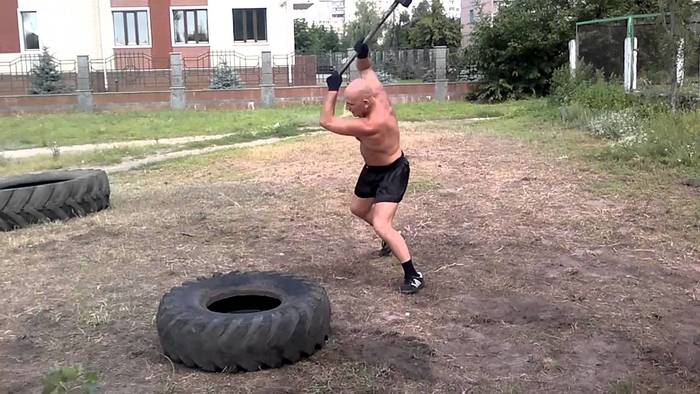 3. Не менее эффективны упражнения с кувалдой. Возьми инструмент (это лучше делать возле гаража), и начинай наносить удары по ненужным покрышкам. Во время выполнения упражнения активизируются именно те мышцы, которые работают при ударе.