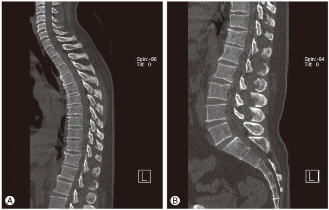 МРТ. Обратите внимание на деформацию позвонков.