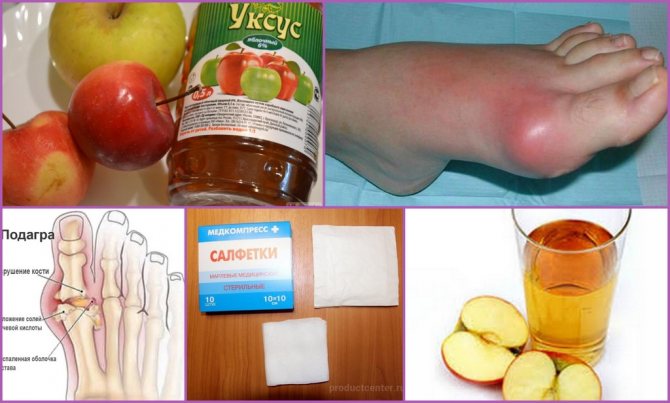Для приготовления обезболивающего компресса при подагре используют яблочный уксус. 6%-ым раствором смачивают марлевую салфетку и прикладывают к больному участку. Во избежание ожогов примочку держат не более получаса.