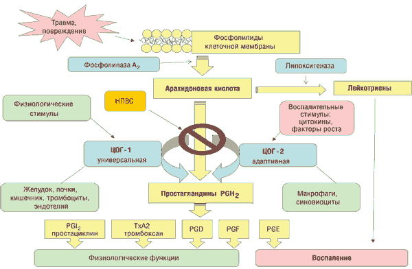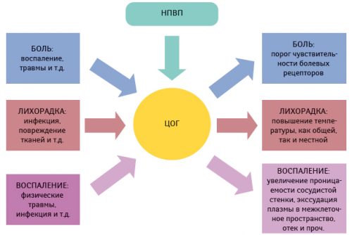 Принцип действия НПВП основан на нарушении синтеза медиаторов боли — простагландинов. Медиаторами боли называются химические вещества, которые образуются в ткани при ее повреждении. Выработка простагландинов в человеческом организме контролируется ферментом циклооксигеназой (ЦОГ). Фермент ЦОГ принимает участие в превращении арахидоновой кислоты в простагландины. НПВС угнетают циклооксигеназу, не позволяя ей синтезировать простагландины. Из-за снижения количества простагландинов уменьшается боль, понижается температура тела, затухает воспалительный процесс.