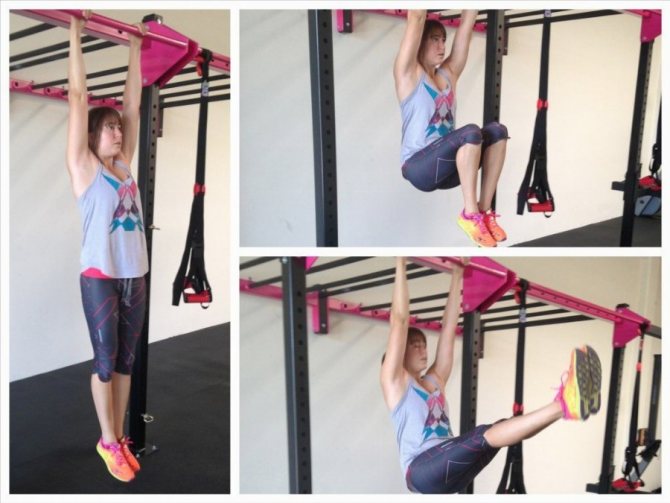 - Повиснув на турнике, согнутые ноги тянем к животу;