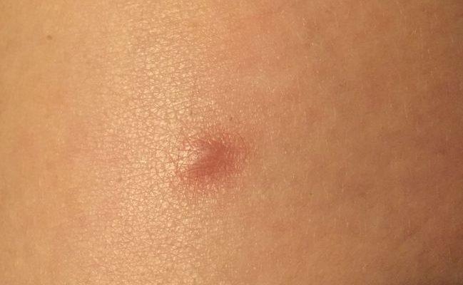 - На коже появляется яркое пятнышко, отграниченное четким валиком, сформированным из немного приподнятой кожи.