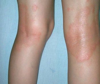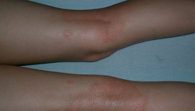 Красные пятна под коленками у взрослых могут свидетельствовать об этом дерматологическом заболевании. Оно также сопровождается зудом, отечностью и шелушением кожных покровов.