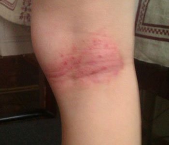 - Сыпь выглядит, как маленькие кристаллики-пузырьки, кажется розовой либо красной. Пузырьки могут лопнуть, оставляя по себе шелушащиеся и раздраженные участки.