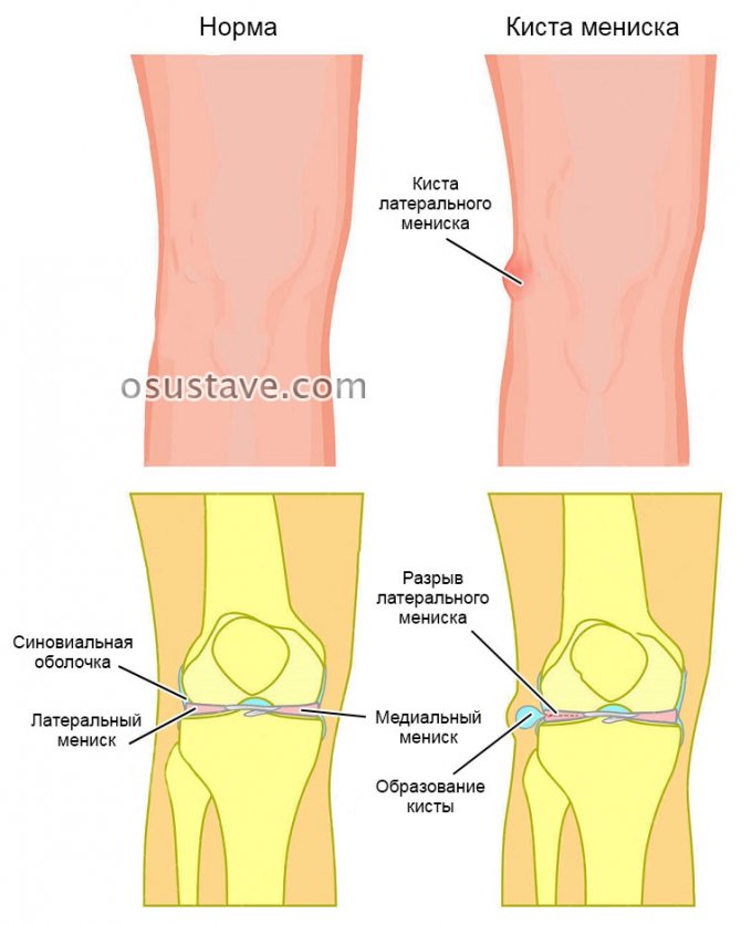- Киста мениска, образуется в толще хряща (внутрименисковая), появляется в результате кистозного перерождения тканей.