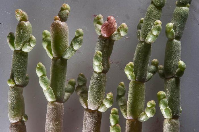 Это однолетнее травянистое растение часто называют солянкой. И это неправильно. Несмотря на то что эти растения принадлежат к одному семейству, они все же являются полярно разными: кустарник солянка не имеет ничего общего с травой солерос. У этого суккулента побеги и ветви представляют собой цилиндрические сочленения – прямые, разветвленные и голые. Листья у растения неразвиты, а цветки собираются в колосовидные соцветия на коротеньких ножках. Пик цветения наступает в июле-августе. Созревающие к ноябрю плоды имеют овальную или яйцевидную форму.