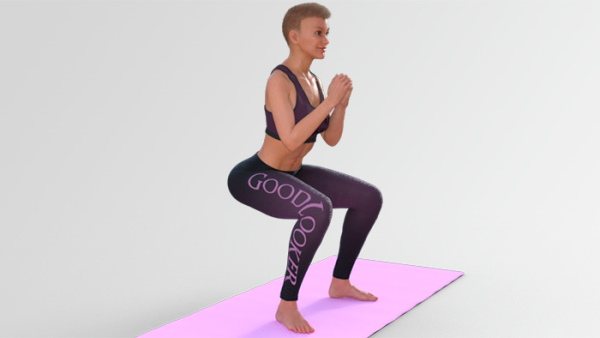 Как выполнять: Поставьте ноги широко, разверните носки друг от друга. После чего выполните присед, пока угол в коленном суставе не станет прямым. Отводите таз назад, корпус наклонен вперед. Руки сложите перед собой.