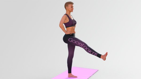 Как выполнять: Руки сведите перед собой, после чего встаньте на левую ногу, поймайте баланс и отведите правую ногу в сгибе назад. Корпус при этом слегка наклоняется вперед.