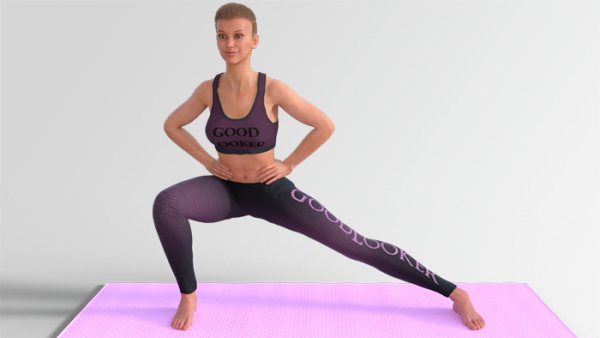 Как выполнять: Сделайте широкий шаг вперед и присядьте. Проследите, чтобы сгиб в колене впереди стоящей ноги образовывал угол в 90 градусов. Задняя нога прямая и уверенно стоит на носке. Руки поставьте на пояс.