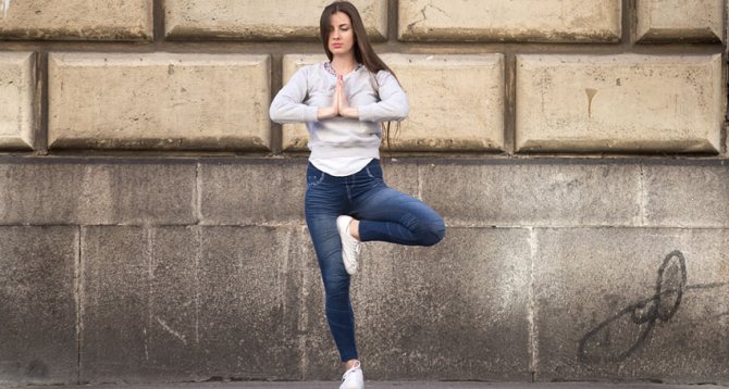 . 1. Встаньте спиной к стене. Одну ногу пяткой уприте в колено второй ноги. Делайте приседания, упираясь ладонями в стену. Смените ногу и повторите столько же раз.