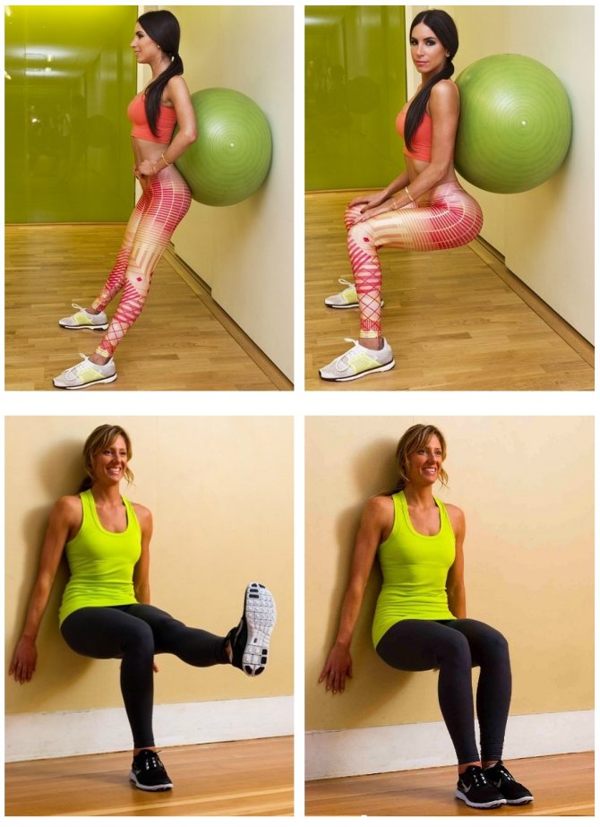 С приседанием у стены. Статическое упражнение может плавно перетечь в динамическое, когда Вы будете поднимать и опускать себя. Просто опускаетесь вниз до параллели полу (как в случае статического стульчика), а затем поднимаетесь вверх, не до конца выпрямляя ноги. Повторяете нужное количество.