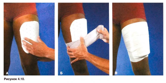 Лечение ушиба при сильном повреждении мягких тканей бедра осуществляется в больнице блокадами новокаина. От голени до паховой области делают масляно-бальзамическую повязку. Конечность размещают на экстензионном аппарате Белера на 14–18 суток.
