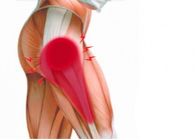 При травме возникает ушиб тканей бедра и сосудов. Чем больше травма, тем обширней зона поражения, поэтому появляются синяки на теле. Без должного лечения может возникнуть воспаление или разрастание соединительной ткани, которое со временем начнет замещать мышечные волокна бедра.