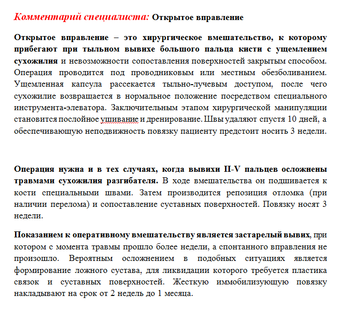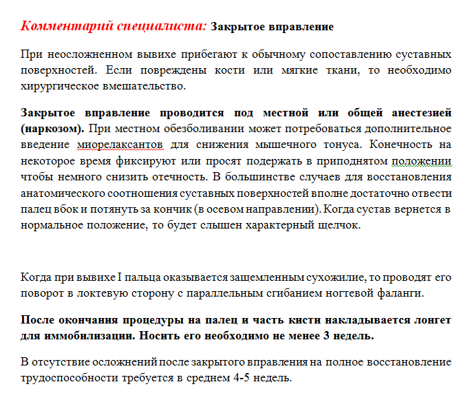 Чтобы вправить вывих пальца, нужно деть пациенту местное обезболивание с выраженной способностью расслабления мышц. Травмированная кисть фиксируется в положении полупронации. Вывихи тыльного направления вынуждают крепко фиксировать предплечье. Делая упор на основание большого пальца, врач крепко хватает его и методом плавного, но довольно сильного движения в сторону переразгибания, возвращает кость на свое место в суставе.