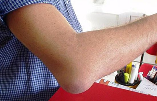 Коварство болезни состоит в ее бессимптомном течении вначале, а между тем воспалительный процесс прогрессирует, и на локтевом суставе появляется мягкая шишка. Подвижность сустава нарушается, человек чувствует сильную слабость, повышается температура тела, локоть болит и отекает.